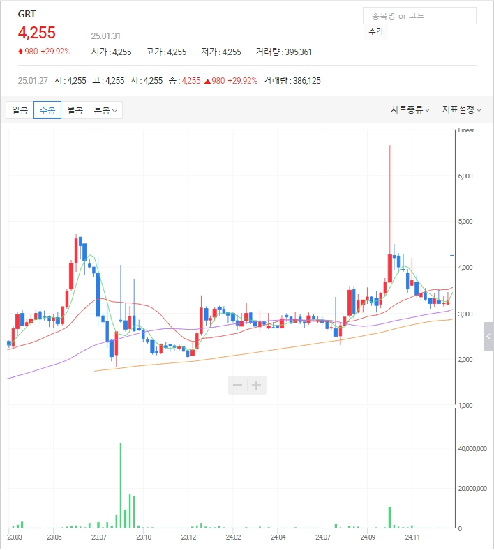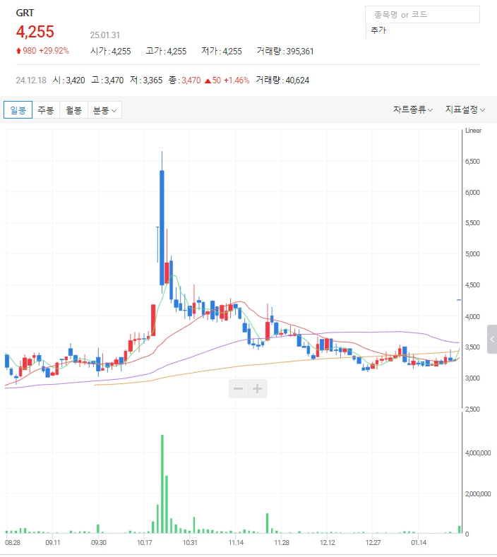 GRT 주가: 현재 1월 31일 기준 GRT는 딥시크 대장주로 상한가에 진입하였습니다. 상한가 후 눌림목 매매를 하시는 것이 안전한 매매입니다.