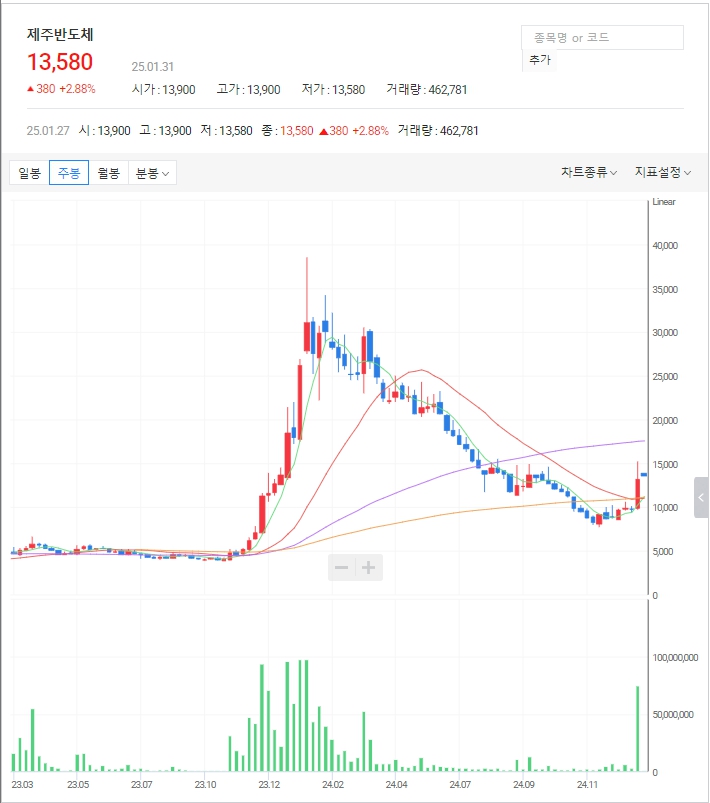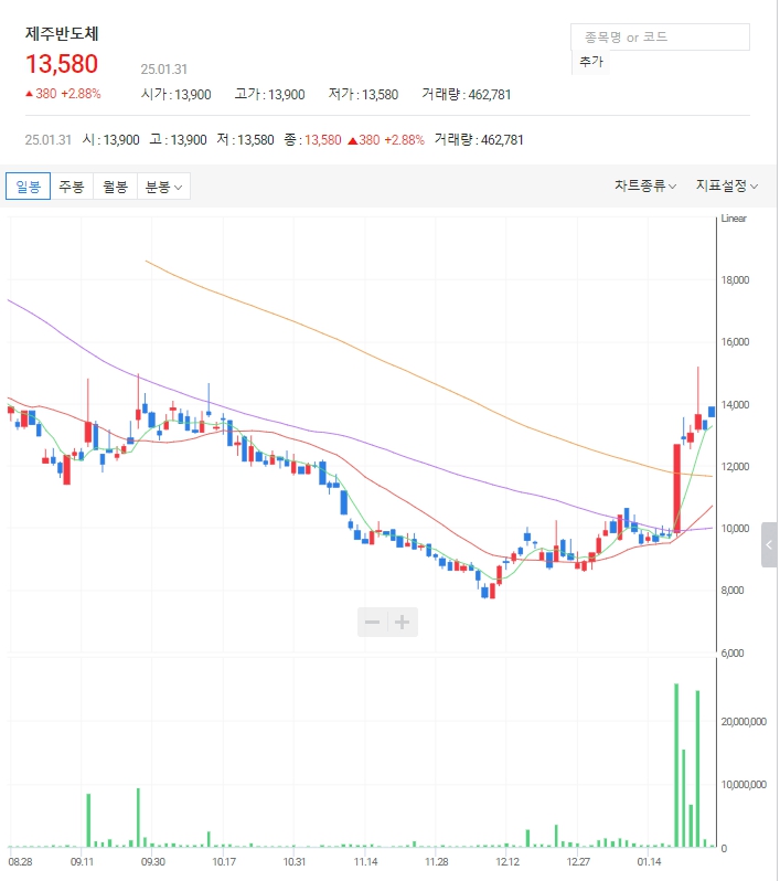 제주반도체 주가: 1월 20일 대량 거래량과 장대 양봉이 나왔습니다. 해당 봉을 기준봉으로 삼을 수 있으며 추세 전환이 시작되었습니다.