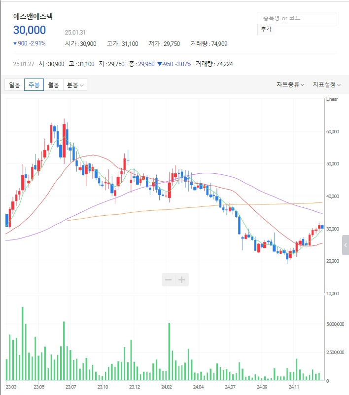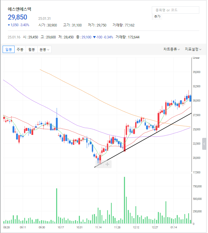에스앤에스텍 주가: 최근 꾸준하게 상승을 하고 있습니다. 저점을 이은 추세선을 깨지 않는 다면 쭉 우상향 가능성이 있습니다.