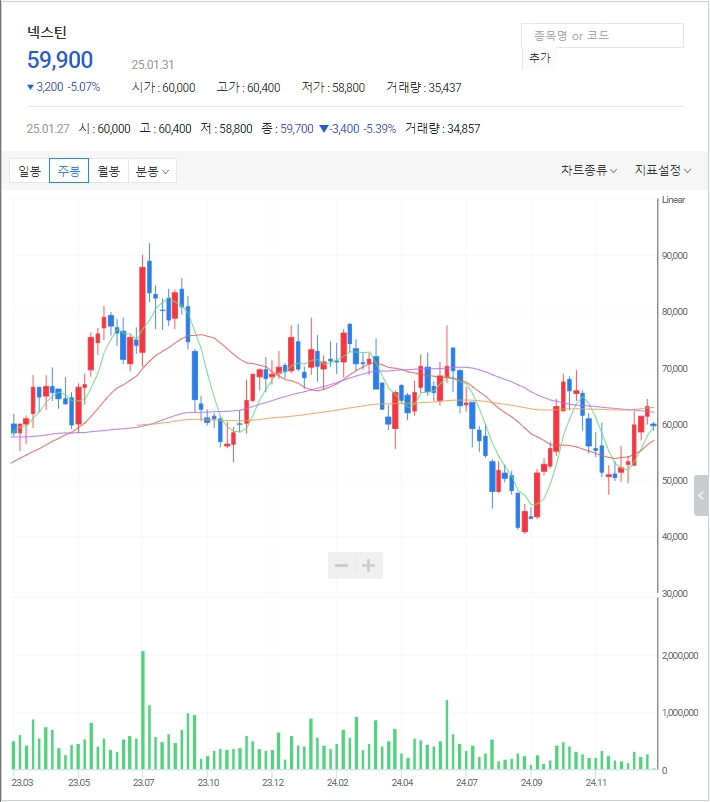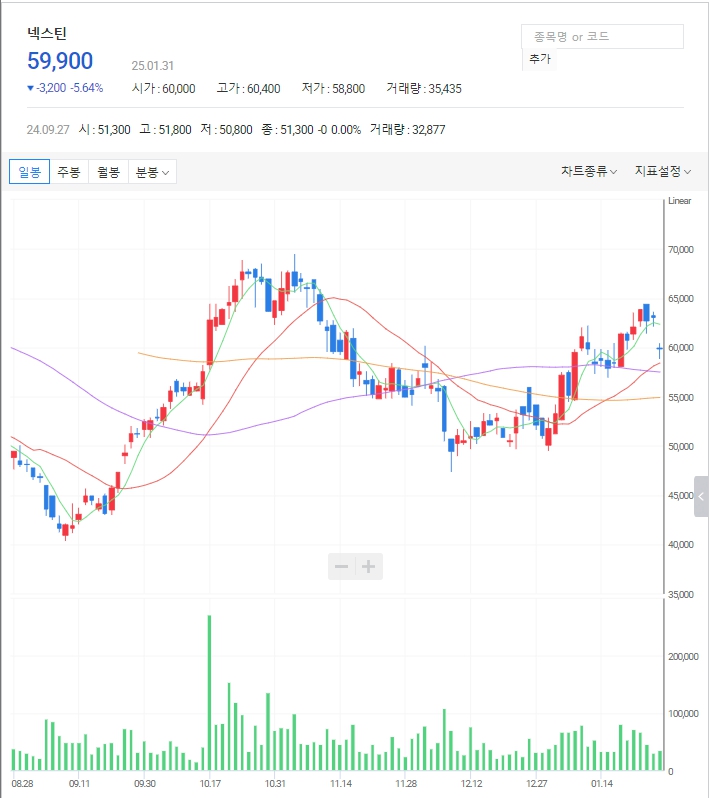 넥스틴 주가: 1월 31일 추세를 이탈하는 갭하락이 나왔지만 20일선 위에서 지지받고 있습니다. 다시 상승 추세를 복귀하는지 확인을 해야 하며, 이전 고점 약 69,000~70,000원을 돌파할 경우 추가 상승의 여력이 있습니다.