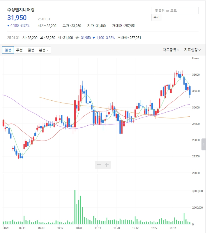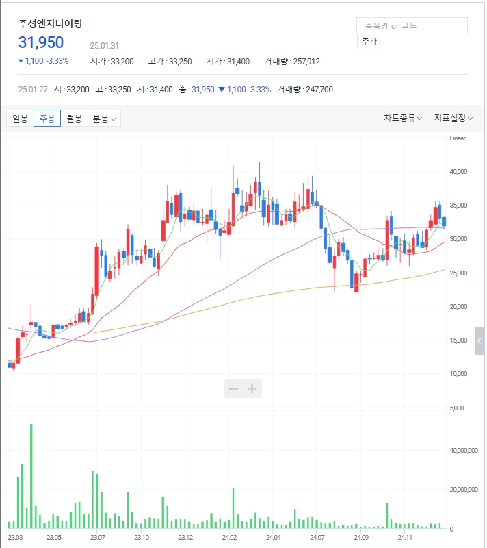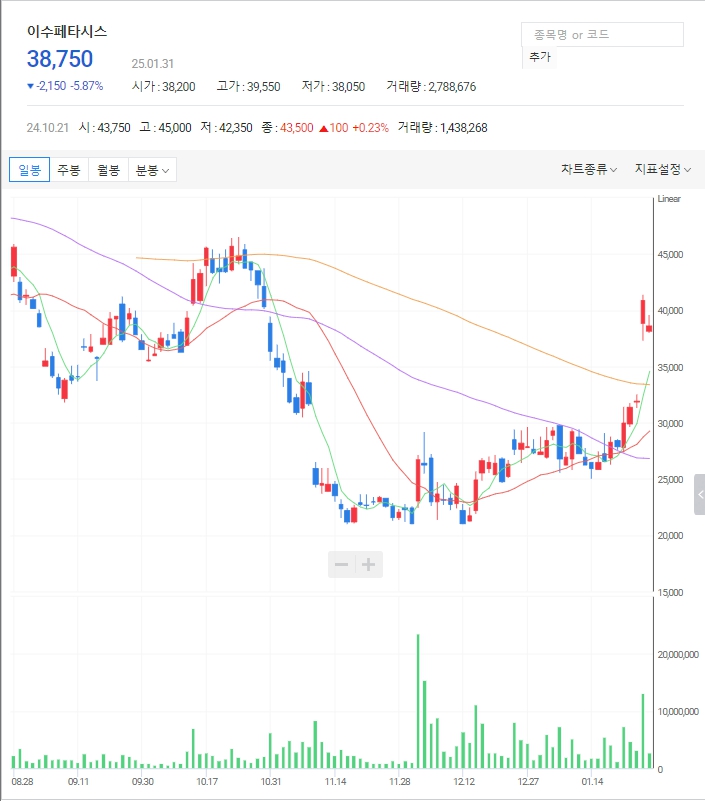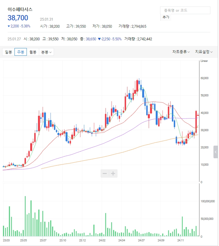이수페타시스 주가: 최근 큰 하락 후 상승추세로 추세전환을 하고 있습니다. 32,000원~37,000원의 큰 갭을 메웠다가 다시 상승할지 계속해서 상승할지 관심일 필요합니다.